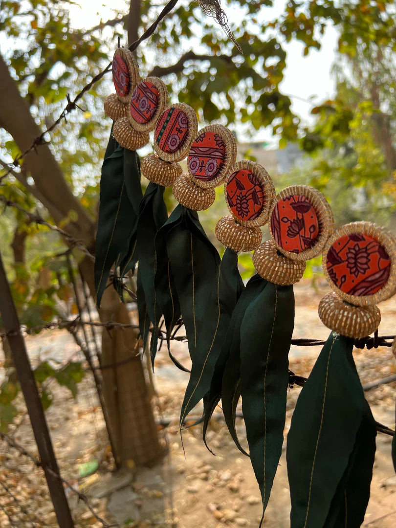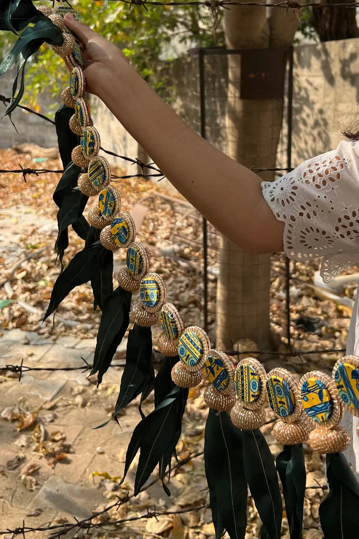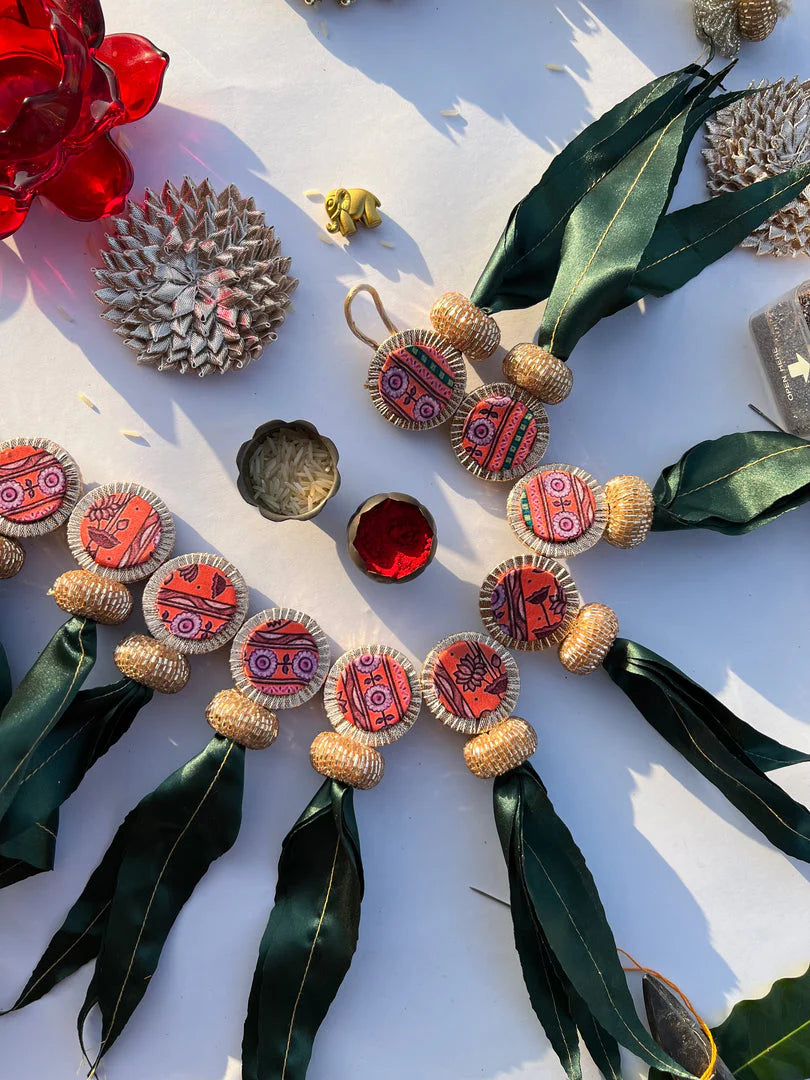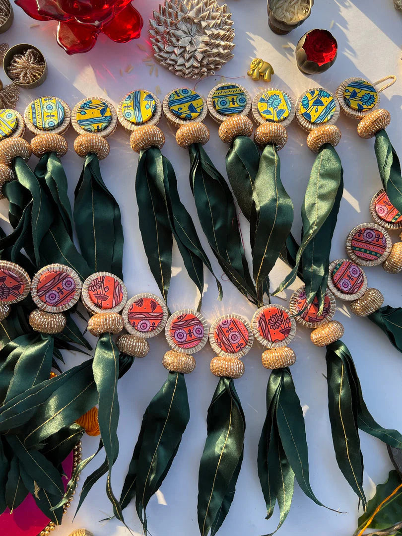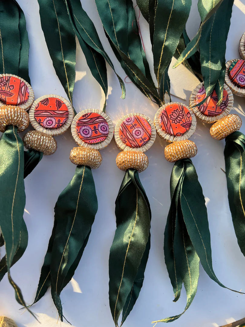 Festivals and occasions in the Indian culture have a mandatory Asopalav Toran, made on a traditional red bundle of threads. We have evolved this beautiful tradition with Asopalav leaves made using silk fabric and symbolic replacement for flowers, adding permanency.