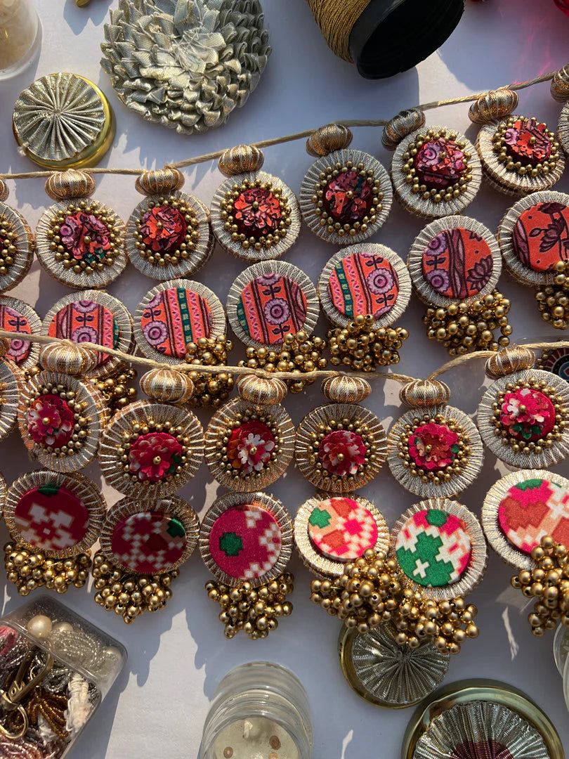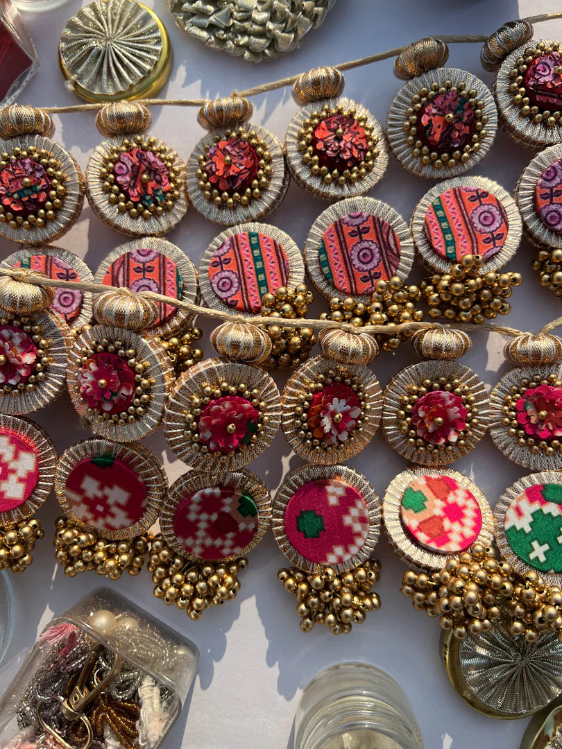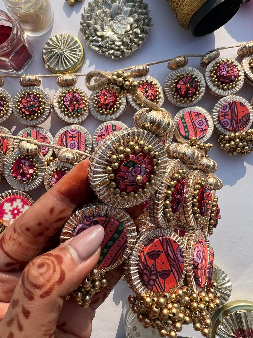 Details: Each pair of lumba is stitched together on one piece of thread. The lumba which holds the flowers is 1.5 inches in diameter. Each lumba is attached to a wooden bead which is wrapped with rose-gold tone Gota Patti. For the hooks of the toran, the silk thread is stitched with small beads into a loop. The total length of each tasseled lumba bunch is 5 inches.