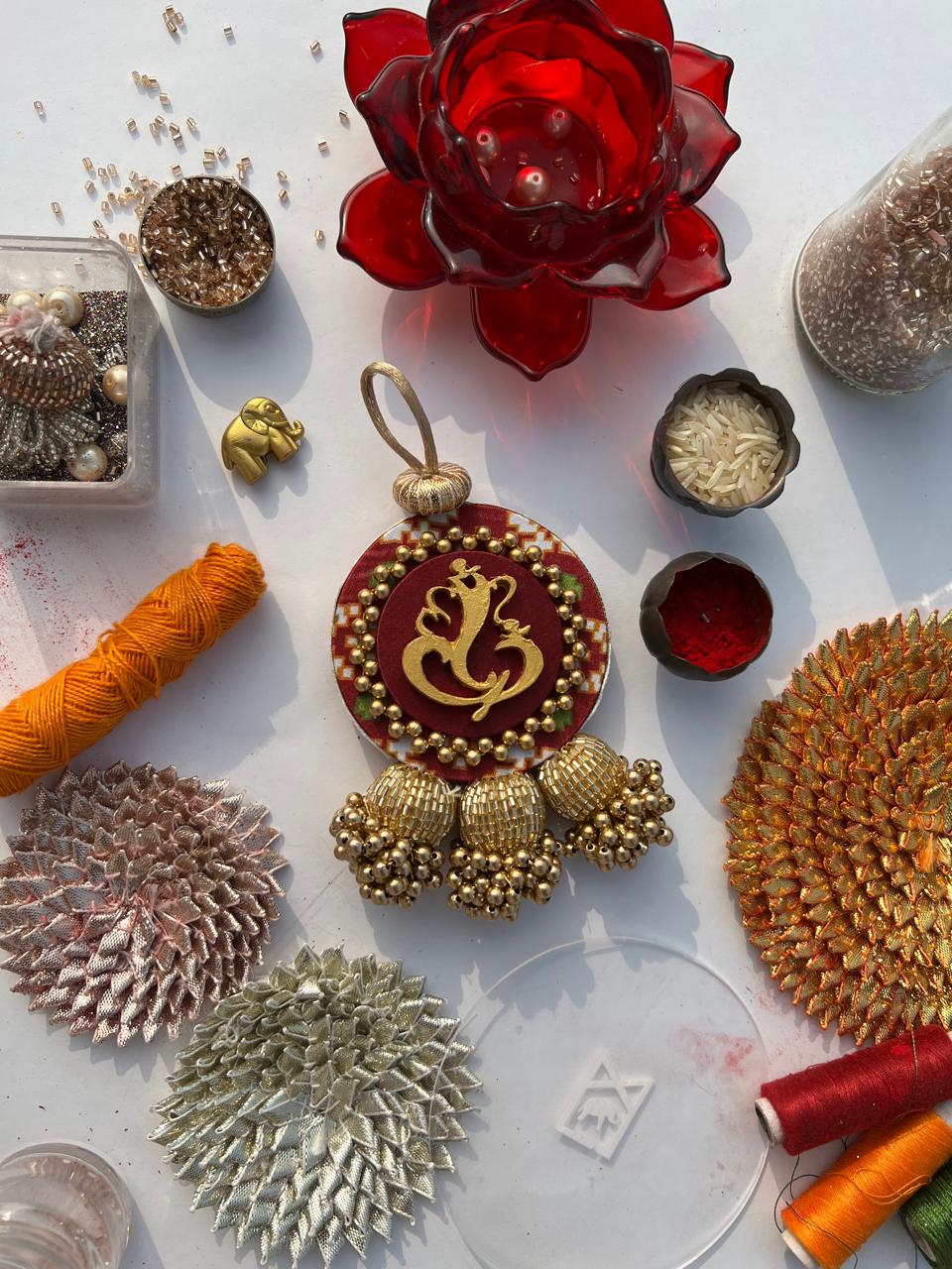 Compliment corners of your main door and mandir with this adorable charm, the solid silk background highlights the hand-painted golden motif of Ganesh.